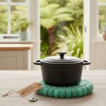 This calming green trivet is inspired by native fern-covered valleys. It is durable, heat-resistant, and eco-friendly, it is both a practical kitchen essential and a stylish addition to your home.