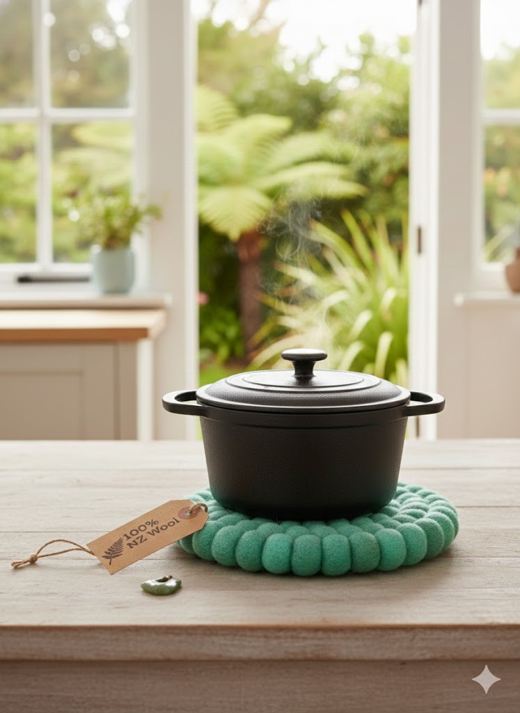 Protect your kitchen and dining surfaces with our premium handmade wool trivet, crafted from 100% New Zealand wool. Designed to safely hold hot pots, pans, and serving dishes, this trivet helps prevent heat damage while adding a natural, elegant touch to your table.